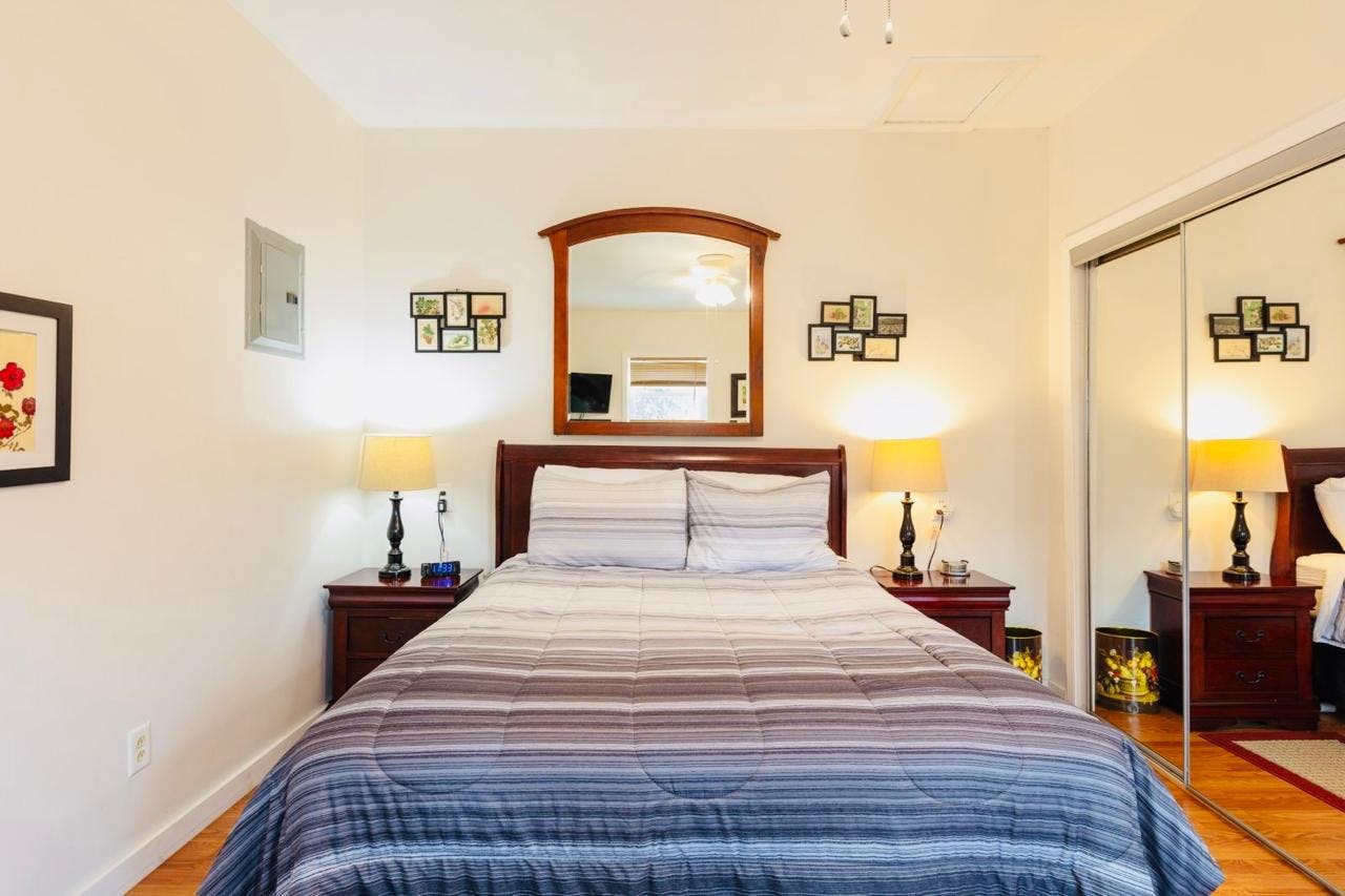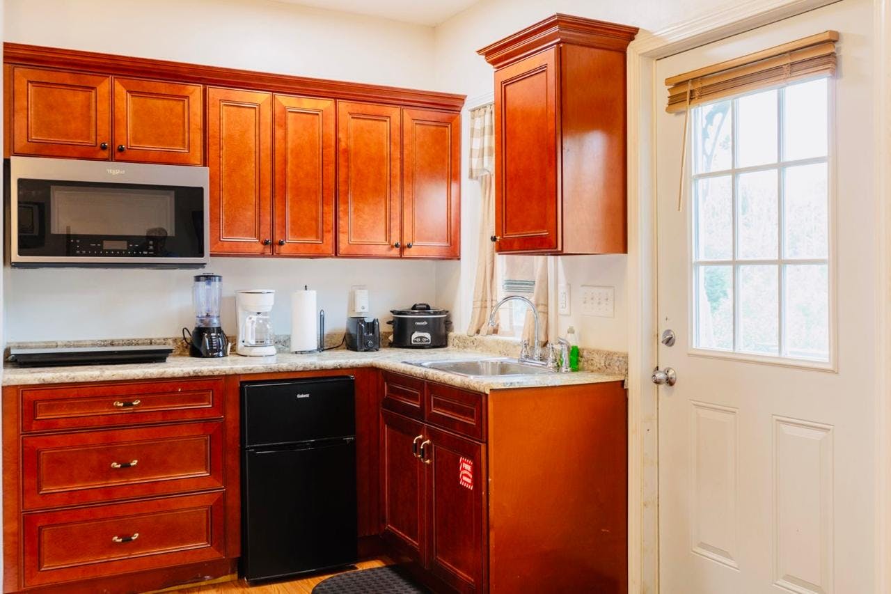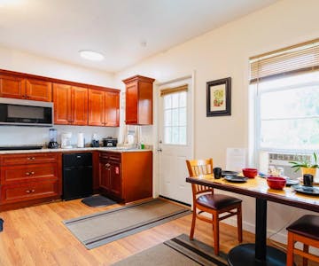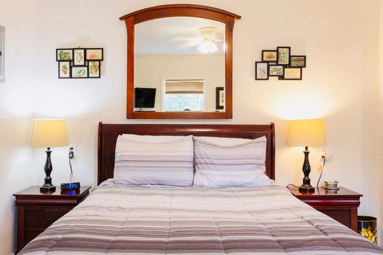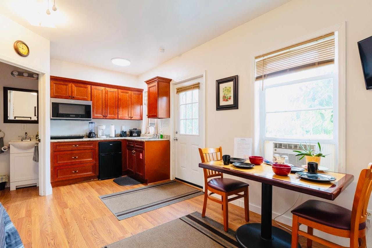 This room have a private outdoor entrance, queen sized beds, television, cooling and heating, their own bathrooms and kitchen. Guests are invited to graze on the fruit we have in the garden, and to harvest herbs and vegetables to cook in your own rooms. All kitchens are fully equipped with a microwave, an induction stovetop, a slow cooker, a toaster, blender, coffee maker, pots and pans, cooking utensils, cups, glasses, plates, and utensils. Coffee, salt, pepper, sugar, teabags, half and half, and instant coffee are supplied. All rooms have a welcome set of fruit bars and chocolates. All linens and bedding are provided, and well as two to three sets of towels. Clocks, clock radios, personal safes, cleaning supplies, and night stands are furnished in each room. Bathrooms have first aid supplies, shampoo, body soap, and liquid hand soap. All rooms feel homey and cozy.